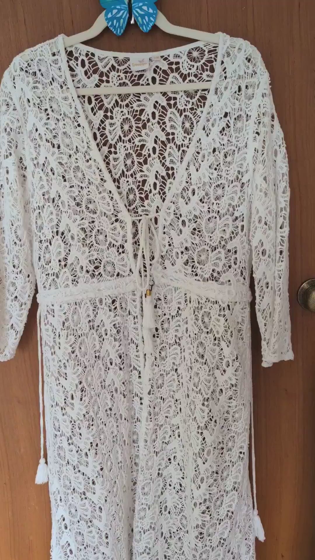 This stunning piece features intricate crochet detailing that creates