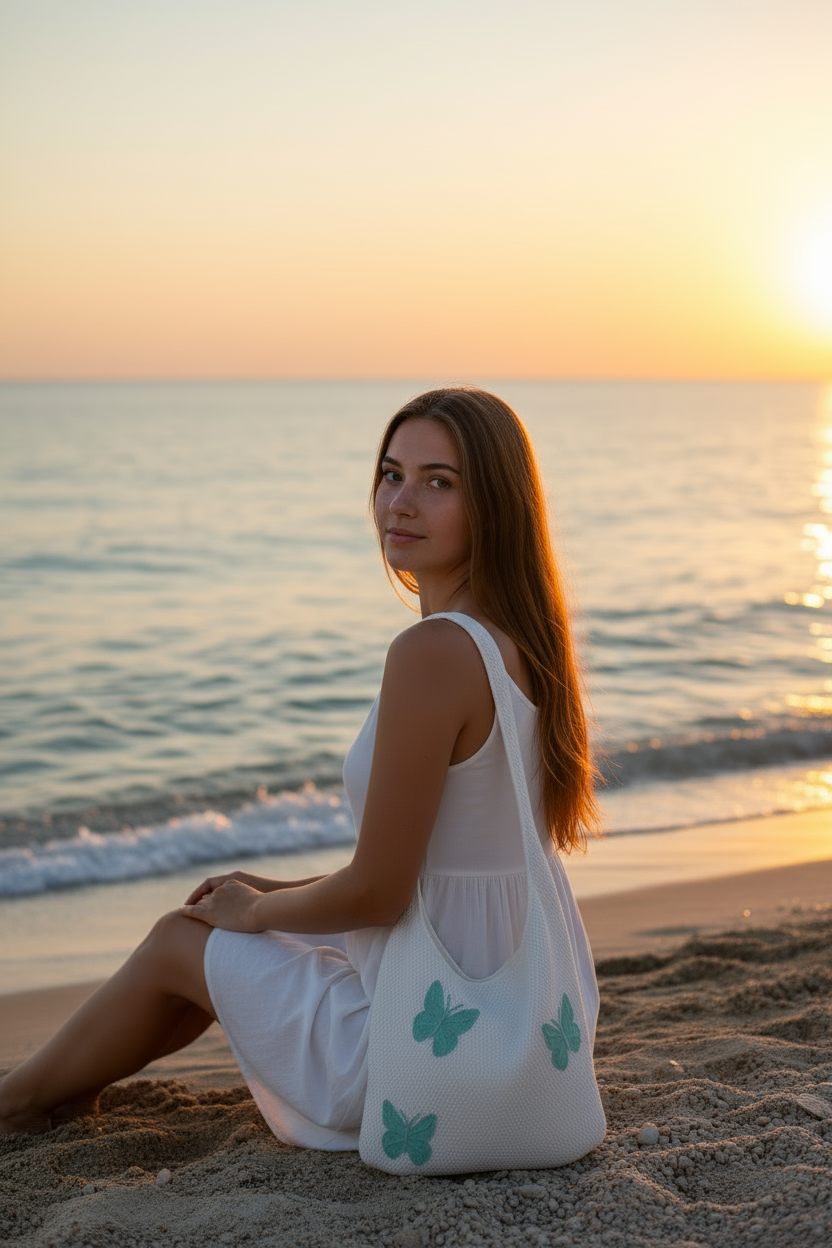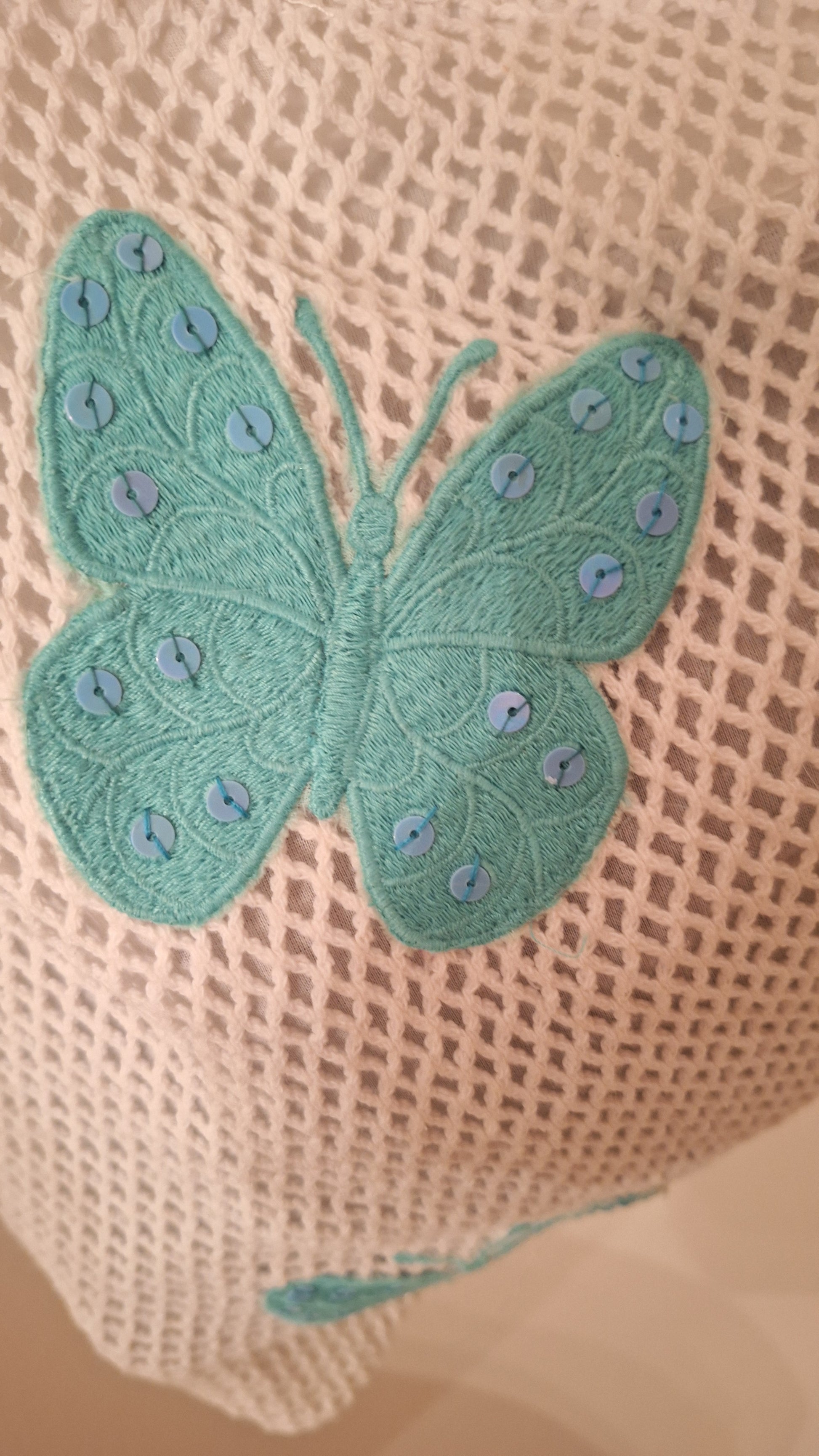 and brings the same delicate beauty to your accessories.Carry your essentials in style with our Papillon Tote. This white crochet bag features hand-beaded aqua embroidered butterflies. This stunning tote can be worn cross body or over the shoulder and with the magnetic clasp your belongings are secure. The tote is fully lined, ensuring your essentials are protected while you make a statement. Wear from day to night.